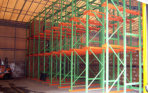 랙내에 Fork Lift 가 들어가는 드라이브인랙은 물품의 종류가 적은 것을 대량으로 보관하는 시스템이다. 소품종 대량화물보관에 최적이며 회전율이 높고 파렛트단위의 배치에 의해 선입선출과 선입후출로 보관되는 물품에 가장 적합하다.